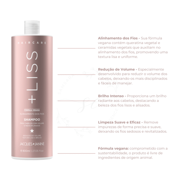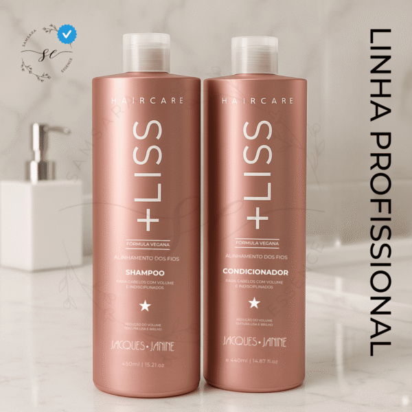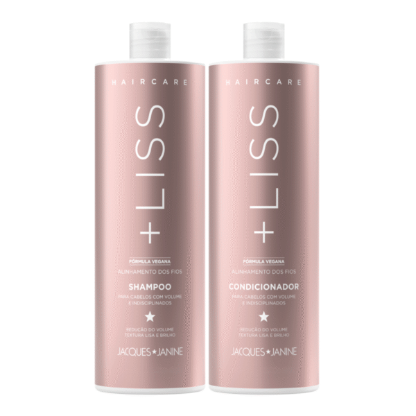 O Kit Jacques Janine +Liss foi desenvolvido para cabelos com volume e indisciplinados, oferecendo redução do frizz e alinhamento dos fios logo nas primeiras aplicações. A fórmula vegana, enriquecida com ativos disciplinantes e agentes hidratantes, promove efeito liso com brilho natural e duradouro, sem pesar nos fios.