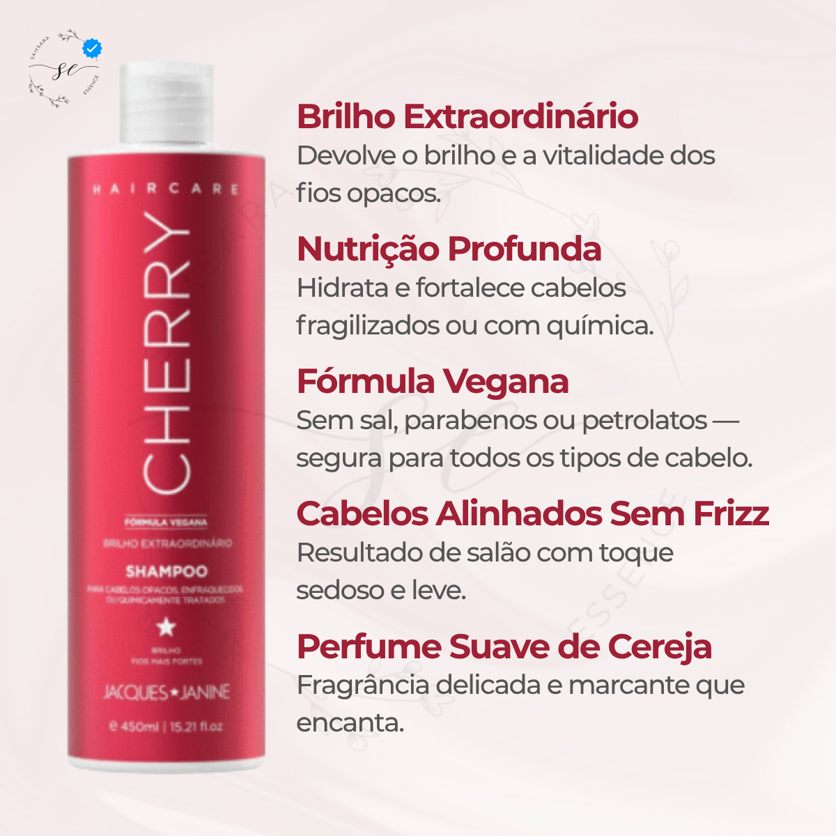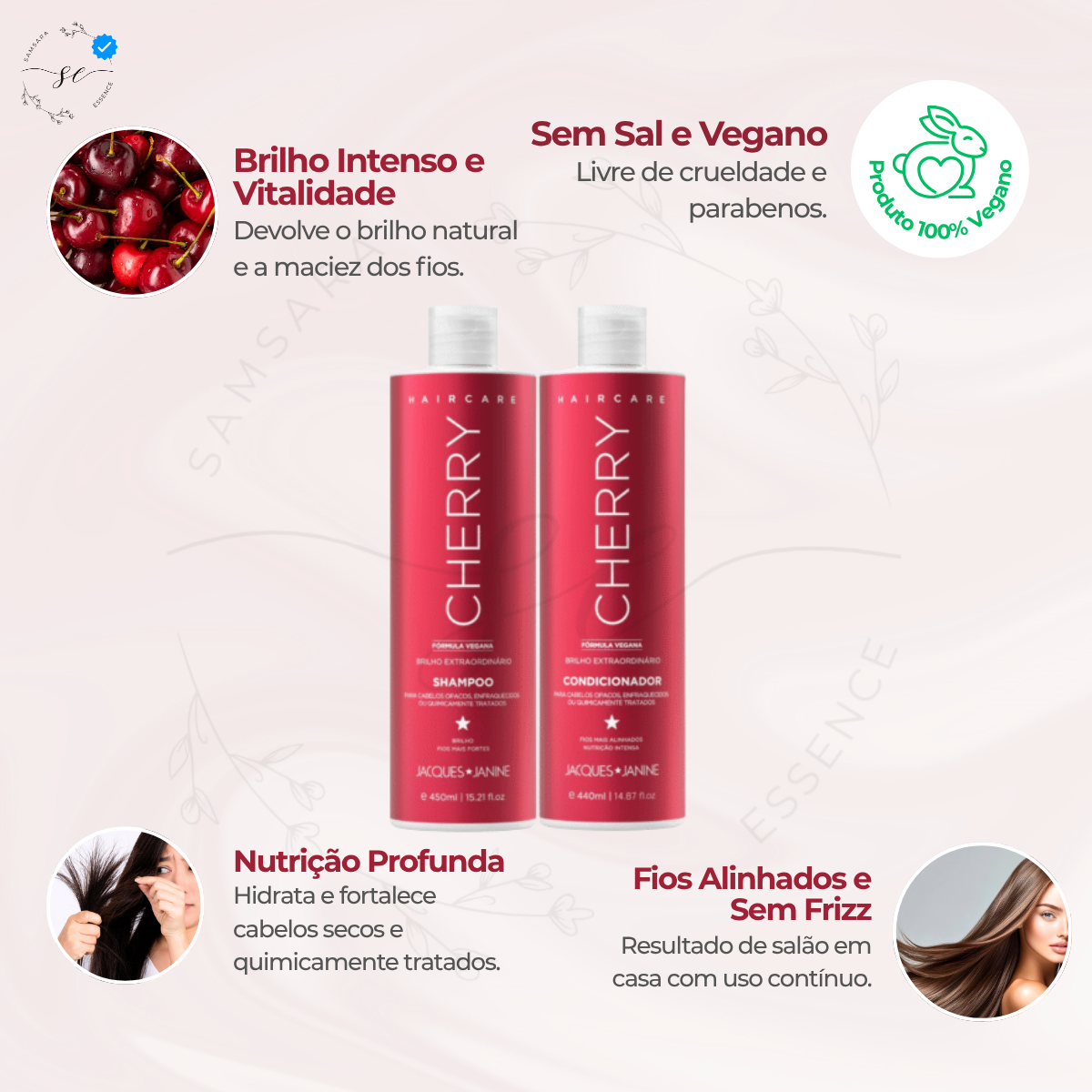 Indicado para cabelos opacos, ressecados ou sem vitalidade, sua fórmula vegana promove brilho extraordinário, maciez e fios visivelmente mais saudáveis. Além de cuidar profundamente da fibra capilar, o kit proporciona uma fragrância envolvente inspirada na cereja, deixando os cabelos perfumados e sedosos ao longo do dia.