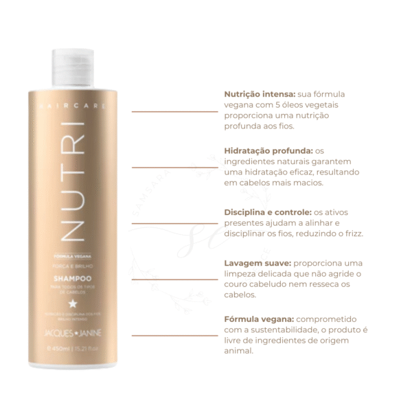 O Kit Nutri Jacques Janine Haircare oferece um tratamento completo de nutrição, ideal para cabelos ressecados, opacos ou sem vida. Com uma poderosa combinação de cinco óleos vegetais – soja, algodão, manga, oliva e amêndoas –, ele proporciona nutrição intensiva, selamento das pontas, brilho radiante e toque suave desde a primeira aplicação.